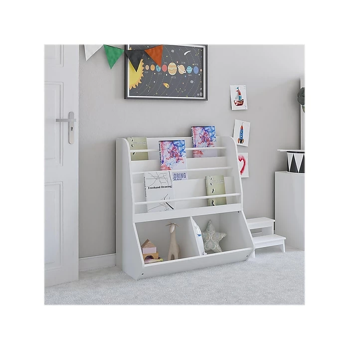 - Two open compartments can easily organize your child’s toys and games, while the three shelves are perfect for their favorite books (fixed)