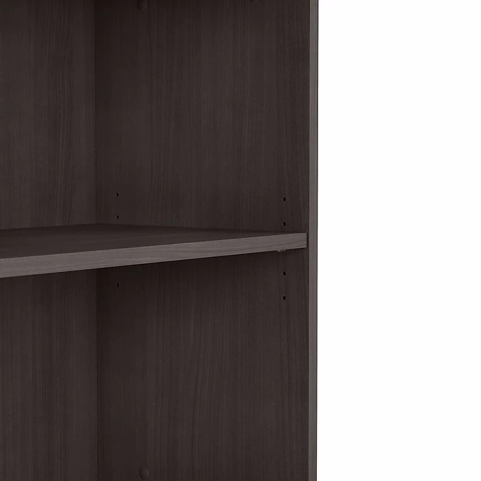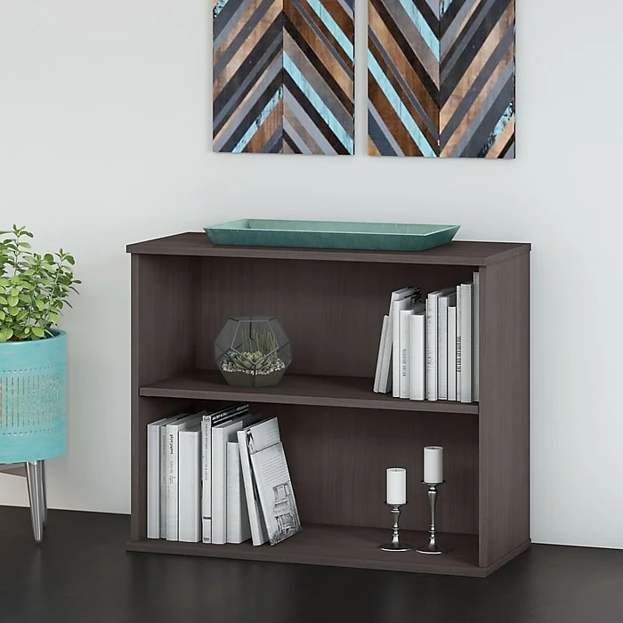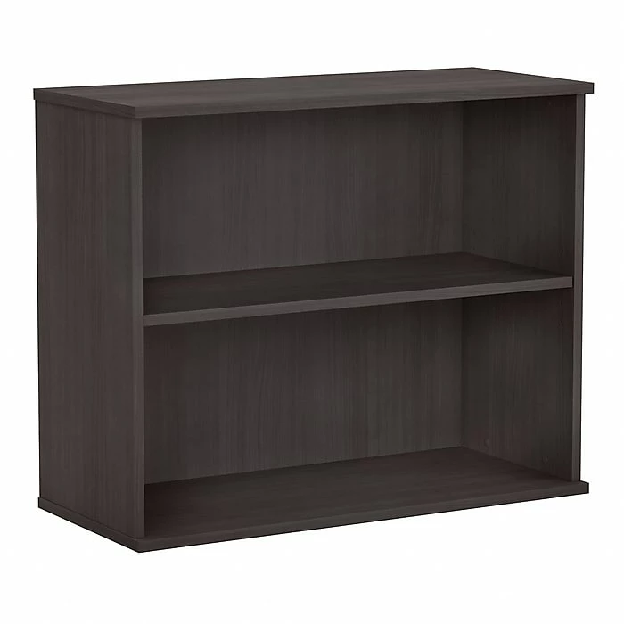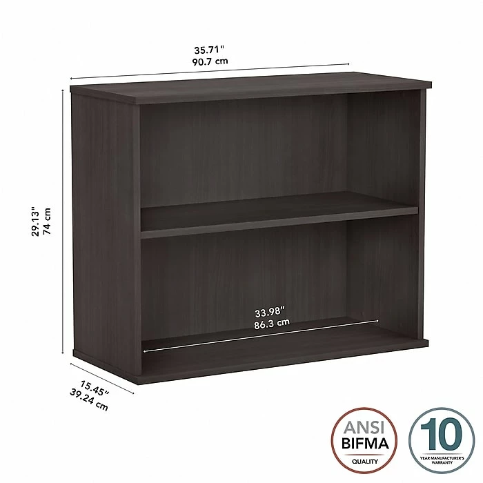 Keep work materials organized and accessible while conveying a classic, professional appearance with the Bush Business Furniture small two-shelf bookcase. Use the shelves to store books, reference materials, and supplies, or give your office a personal touch with pictures and decorations. One shelf is fixed for stability, and the other can be raised or lowered to accommodate items of various sizes. Each shelf supports up to 50 lbs., so storing larger materials is no problem. The efficient design and commercial-quality construction of this low bookcase make it an ideal storage and display solution for home and professional offices alike. A stable design and included wall attachment hardware provide peace of mind in every work environment. This small bookcase has been tested to meet ANSI/BIFMA quality standards for safety and performance and is backed by a 10-year manufacturer warranty.