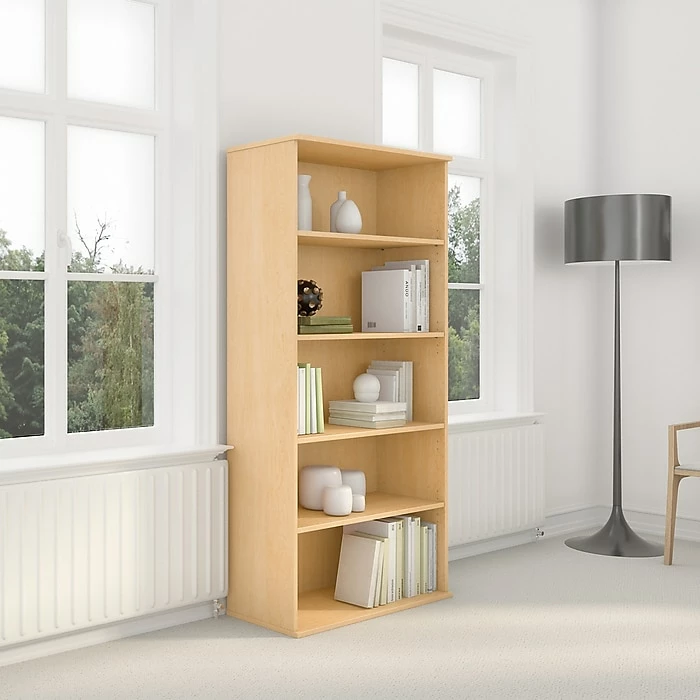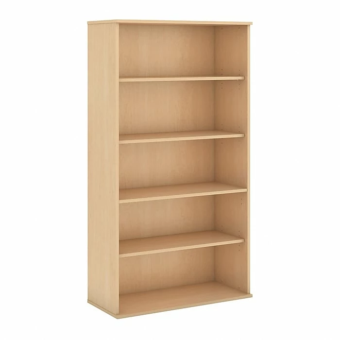 The Bush Business Furniture 72H 5 Shelf Narrow Bookcase in Natural Maple with a durable, thermally fused laminate surface offers superior resistance to scratches and stains. The 36W Bookcase features two fixed shelves for stability with three adjustable shelves for storage flexibility. Personalize your office with books, photos and decorative accents with Bush Business Furniture Bookcases in six finishes and five height options, plus wall attachment hardware included. Meets ANSI/BIFMA standards for safety and performance in place at time of manufacture, backed by Bush Business Furniture 10 Year Warranty and American made.