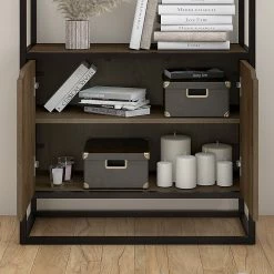 By combining a trio of distinct materials into an industrial modern design, the Bush Furniture Anthropology 5-shelf bookcase with doors offers a unique storage solution that’s equal parts style, function and durability. Cabinet doors cover the bottom of the tall bookshelf while the upper portion is left open to show off your personal library or brighten up the room with pictures and decorations. Each shelf supports 25 pounds, so storing paperback and hardcover books is never an issue. Four shelves are fixed for stability while the cabinet contains one adjustable shelf to accommodate bulkier items like binders and photo albums. An anti-tip wall restraint is included for family-friendly safety and security in any home office or living room.