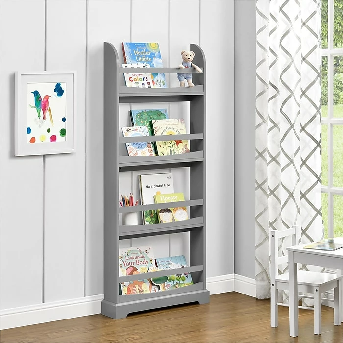 - Tall etagere bookcase is made of engineered wood in a storm gray finish