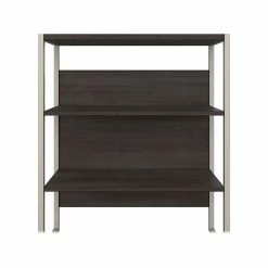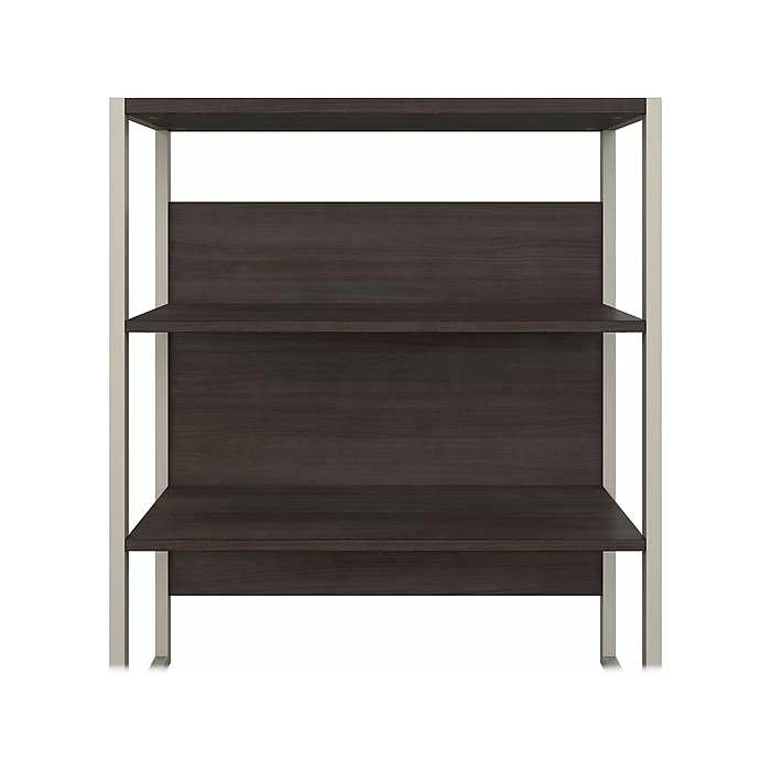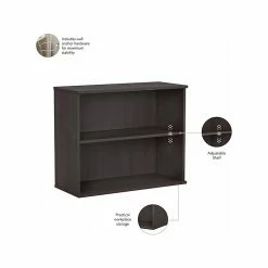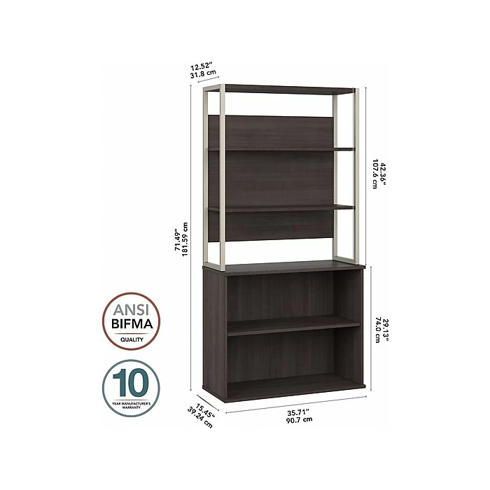 The Bush Business Furniture Hybrid tall etagere bookcase offers a stylish, long-lasting storage and display solution for the modern professional. Organize books and other reference materials, or decorate your workspace to give it a personal touch on shelves that support up to 50 lbs. each. The lower section contains one fixed shelf for stability and another that can be raised or lowered to accommodate items of various sizes. The open shelves are perfect for storing a small library or showcasing your favorite plants, pictures, and knickknacks. The tall bookcase’s stable design and included wall attachment hardware make it a safe choice for use in virtually any home or professional office environment. Find the perfect look for your space with five contemporary finish options: black walnut, modern hickory, platinum gray, storm gray, and white. This five-shelf bookcase has been meticulously tested to meet or exceed ANSI/BIFMA quality standards for safety, durability, and performance and is backed by the Bush Business Furniture 10-year manufacturer warranty. See the full Bush Business Furniture Hybrid collection for coordinating items to enhance your workspace as needed, including computer desks, file cabinets, and storage cabinets (coordinating items sold separately). American-made with US and imported parts.