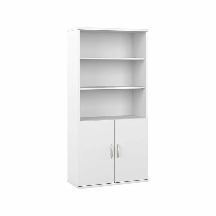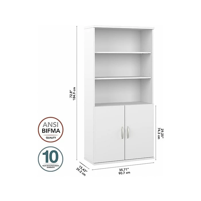 The Bush Business Furniture Hybrid tall five-shelf bookcase with doors offers a stylish, long-lasting storage and display solution for the modern professional. Organize books and other reference materials, or give your workspace a personal touch with pictures and decorations on the shelves that support up to 50 lbs. each. Two shelves are fixed for stability while three can be raised or lowered to accommodate items of various sizes. The cabinet doors conceal the two lower shelves for the materials you want kept in order but out of sight. The tall bookshelf’s stable design and included wall attachment hardware make it a safe choice for use in virtually any home or professional office environment. Find the perfect look for your space with five contemporary finish options: black walnut, modern hickory, platinum gray, storm gray, and white. This tall bookcase cabinet has been meticulously tested to meet or exceed ANSI/BIFMA quality standards for safety, durability, and performance and is backed by the Bush Business Furniture 10-year manufacturer warranty. See the full Hybrid collection for coordinating items to enhance your workspace as needed, including computer desks, file cabinets, and storage cabinets (coordinating items sold separately). American-made with US and imported parts.