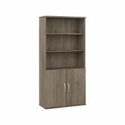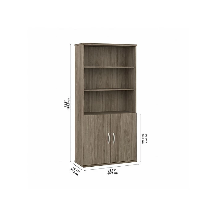 The Bush Business Furniture Hybrid tall five-shelf bookcase with doors offers a stylish, long-lasting storage and display solution for the modern professional. Organize books and other reference materials, or give your workspace a personal touch with pictures and decorations on shelves that support up to 50 lbs. each. Two shelves are fixed for stability, while three can be raised or lowered to accommodate items of various sizes. Cabinet doors conceal the two lower shelves for the materials you want to be kept in order but out of sight. The tall bookshelf’s stable design and included wall attachment hardware make it a safe choice for use in virtually any home or professional office environment. Find the perfect look for your space with five contemporary finish options: black walnut, modern hickory, platinum gray, storm gray, and white. This tall bookcase cabinet has been meticulously tested to meet or exceed ANSI/BIFMA quality standards for safety, durability, and performance and is backed by the Bush Business Furniture 10-year manufacturer warranty. See the full Bush Business Furniture Hybrid collection for coordinating items to enhance your workspace as needed, including computer desks, file cabinets, and storage cabinets (coordinating items sold separately). American-made with US and imported parts.