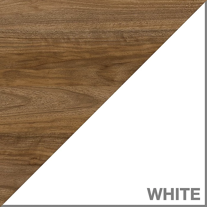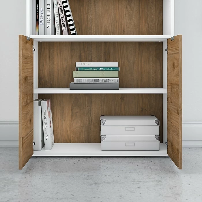 - Five-shelf bookcase with doors made of thermally fused laminate over composite wood in a fresh walnut and white finish