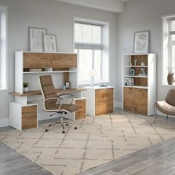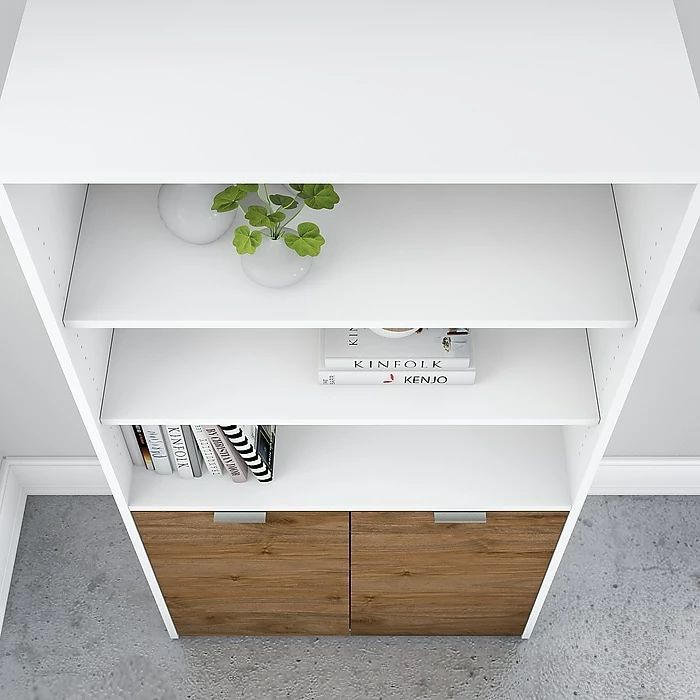 The Bush Business Furniture Jamestown five-shelf bookcase meets the evolving needs of today’s workspaces with a convenient mix of open and closed storage. The Bush Business Furniture Jamestown five-shelf bookcase combines closed storage and open display space to offer an ideal organization solution for the modern professional office. Cabinet doors conceal materials while the top is open to show off pictures and decorations. Three adjustable shelves accommodate items of various sizes, and two fixed shelves give the bookcase its stability. Each shelf supports up to 50 lbs., so you can confidently store a collection of books and binders. Named in honor of BBF’s Western New York headquarters, the Jamestown collection celebrates both the brand’s heritage and its commitment to providing solutions that meet the evolving needs of professional offices. This commercial-grade bookshelf is tested to meet ANSI/BIFMA standards for safety and performance and is backed by a 10-year manufacturer limited warranty. American-made with US and imported parts.