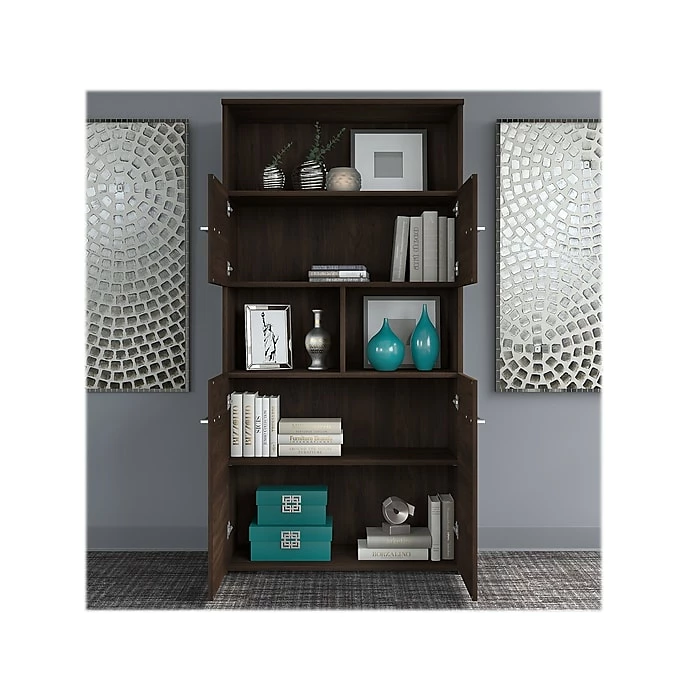 The Bush Business Furniture Office 500 five-shelf bookcase with doors is a great way to stay organized while showcasing your unique style and personality. Use the bottom storage cabinet to conceal the books, binders, and other reference materials you want to be kept in order but out of sight. The cabinet contains one fixed shelf and one adjustable shelf to accommodate items of various sizes. The upper half of the tall bookcase features two cubbies and a long top shelf that are perfect for displaying pictures, awards, and decorations. A smaller cabinet offers even more space to organize office supplies and materials. Shelves support up to 50 lbs. each. This modern bookcase with doors meets or exceeds ANSI/BIFMA quality standards for safety and performance and is backed by a 10-year manufacturer limited warranty. American-made with US and imported parts.
