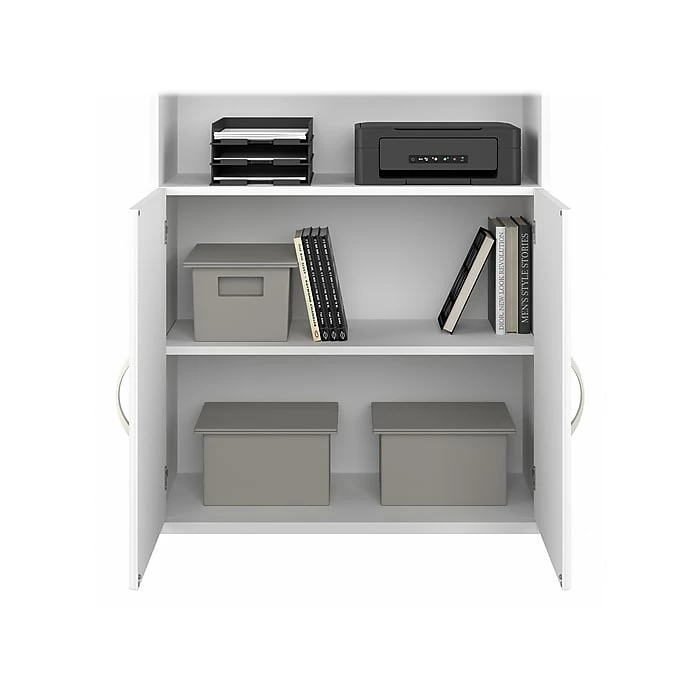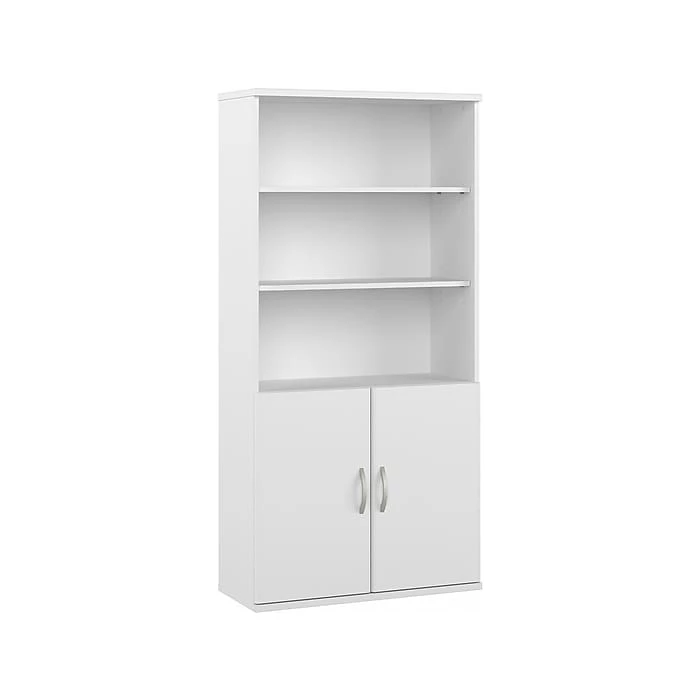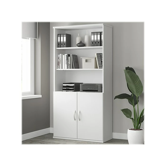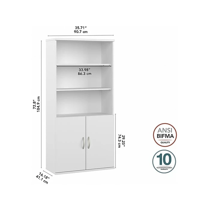 The Bush Business Furniture Studio A tall five-shelf bookcase with doors combines a fresh contemporary appearance with the commercial-quality construction needed to withstand years of everyday use. Organize books and reference materials, or display pictures and decorations on the shelves that support up to 50 lbs. each. Two shelves are fixed for stability, while three can be raised or lowered to accommodate items of various sizes. The cabinet doors conceal the two lower shelves for the materials you want kept in order but out of sight. The tall bookcase’s stable design and wall attachment hardware make it a safe choice for use in virtually any home or professional office environment. This tall bookcase has been meticulously tested to meet or exceed the ANSI/BIFMA standards for safety, durability, and performance and is backed by a 10-year warranty. American-made with US and imported parts.