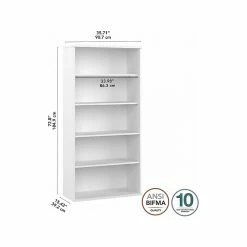 The Bush Business Furniture Studio A tall five-shelf bookcase with doors combines a fresh contemporary appearance with the commercial-quality construction needed to withstand years of everyday use. Organize books and reference materials, or display pictures and decorations on the shelves that support up to 50 lbs. each. Two shelves are fixed for stability, while three can be raised or lowered to accommodate items of various sizes. The tall bookcase’s stable design and wall attachment hardware make it a safe choice for use in virtually any home or professional office environment. This tall bookcase has been meticulously tested to meet or exceed the ANSI/BIFMA standards for safety, durability, and performance and is backed by a 10-year warranty. American-made with US and imported parts.