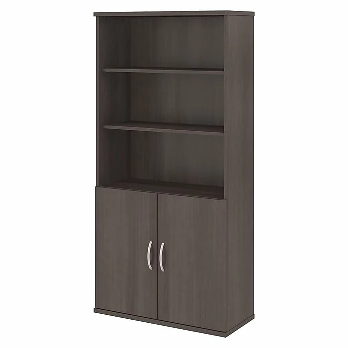 The Bush Business Furniture Studio C 5 Shelf Bookcase looks great, works hard and adjusts to fit the needs of your office. Designed with 2 fixed and 3 adjustable shelves, the Bookcase holds your books and reference materials with room for your favorite decorative accents. Store a variety of items on the spacious and durable shelves, designed to hold up to 50 lbs. each. A thermally fused laminate finish fends off scratches, stains and dents throughout years of everyday use. Add the Bookcase Door Kit (sold separately) to conceal the lower shelves for an organized look. The 5 Shelf Bookcase features a classic design but comes in a contemporary White or Storm Gray finish to fit perfectly in modern workspaces. Purchase a set of Bookcases to build a complete storage wall that organizes your office and expresses your style. This contemporary 5 Shelf Bookcase comes with a 10 Year Warranty and meets ANSI/BIFMA quality test standards. See the full collection for coordinating items available to make your office your own with Studio C. American made with U.S. and imported parts.