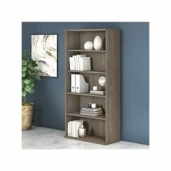 The Bush Business Furniture Studio C five-shelf bookcase looks great, works hard, and adjusts to fit the needs of your office. Designed with two fixed and three adjustable shelves, the tall bookcase holds your books and reference materials with room for your favorite decorative accents. Store a variety of items on the spacious and durable shelves designed to hold up to 50 lbs. each. A thermally fused laminate finish fends off scratches, stains, and dents throughout years of everyday use. The five-shelf bookcase features a classic design, but comes in your choice of the several contemporary and traditional finishes to fit perfectly in any workspace. Purchase a set of bookcases to build a complete storage wall that organizes your office and expresses your style. This five-tier bookcase is backed by a 10-year warranty and meets ANSI/BIFMA quality test standards. American-made with US and imported parts.