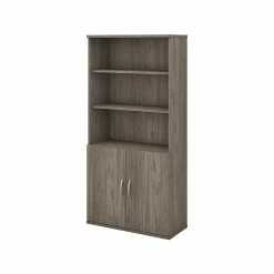 The Bush Business Furniture Studio C five-shelf bookcase with doors looks great, works hard, and adjusts to fit the needs of your office. Designed with two fixed and three adjustable shelves, the bookcase holds your books and reference materials with plenty of room for your favorite decorative accents. Confidently store a variety of items on the spacious and durable shelves, designed to hold up to 50 lbs. each. A thermally fused laminate finish fends off everyday damage such as scratches and stains throughout years of everyday use. Two doors with smooth Euro-style hinges conceal your office supplies and add an eye-catching touch to your workspace. This tall bookcase with doors comes with a 10-year warranty and meets ANSI/BIFMA quality test standards. See the full collection for coordinating items available to make your office your own with Bush Business Furniture Studio C. American-made with US and imported parts.