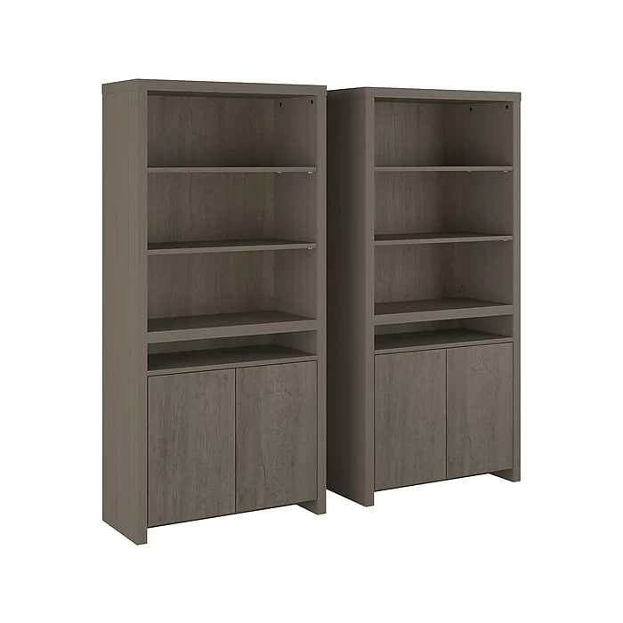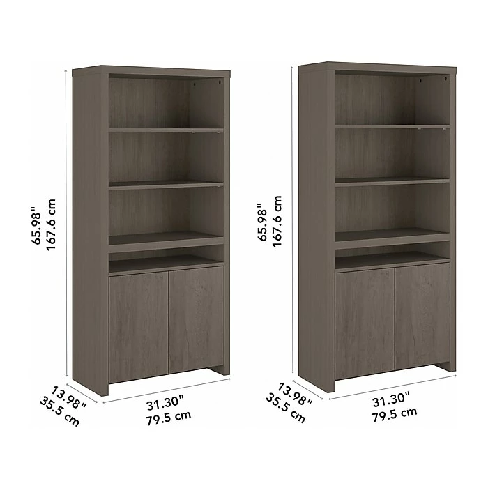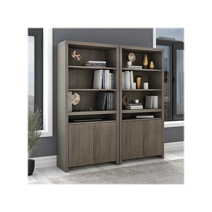 The Bush Furniture Bristol tall bookcase with doors presents a practical storage and display solution with contemporary style. Take advantage of the bookcase’s open shelving to organize your personal library or add charm to any room with pictures and home decor. Two of the upper shelves can be moved up or down to accommodate larger books and decorations while another is fixed for stability. The slim center cubby provides a perfect place to stash magazines, work in progress, and other household items. The bottom of the bookcase features cabinet doors that open to reveal one fixed shelf and one adjustable shelf. Wall attachment hardware is included for family-friendly safety and security. This bookcase has been tested to meet ANSI/SOHO standards for safety and performance and is backed by a 1-year warranty. See the full collection for coordinating items available.