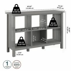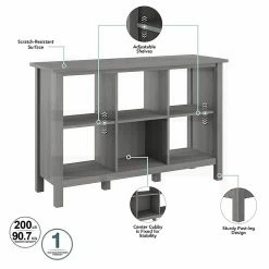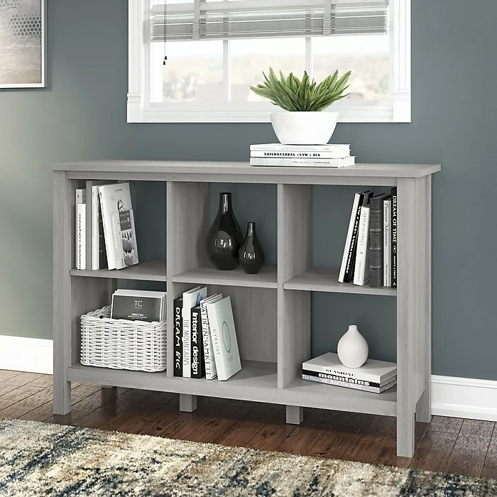 Open and airy, the Bush Furniture Broadview six-cube bookcase breathes contemporary life into your home office or living space. Brighten up any room with art and collectibles or bring a modern flair to work while organizing books, binders, and reference materials. Six storage cubbies with two adjustable shelves let you customize the cube bookcase to showcase decorations and materials of varying shapes and sizes. Each shelf supports up to 30 lbs., so you can store larger items with confidence. Closed side panels and an open back coordinate with existing decor as you display your prized possessions. A sturdy post leg design provides years of trouble-free use in virtually any residential space. This cube bookcase is tested to meet ANSI/SOHO standards for safety and performance and is backed by a 1-year manufacturer limited warranty. See the full collection for coordinating items available.