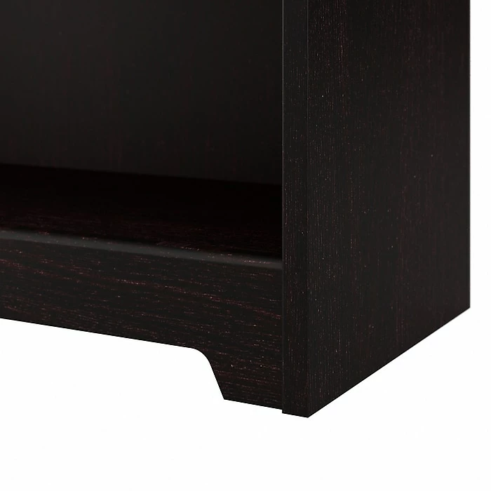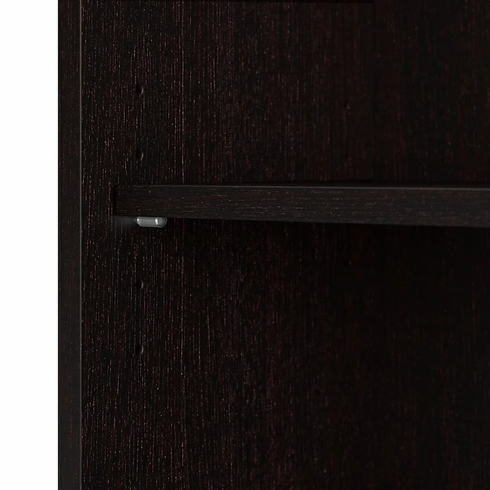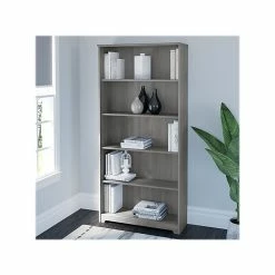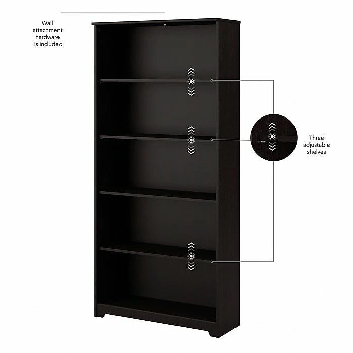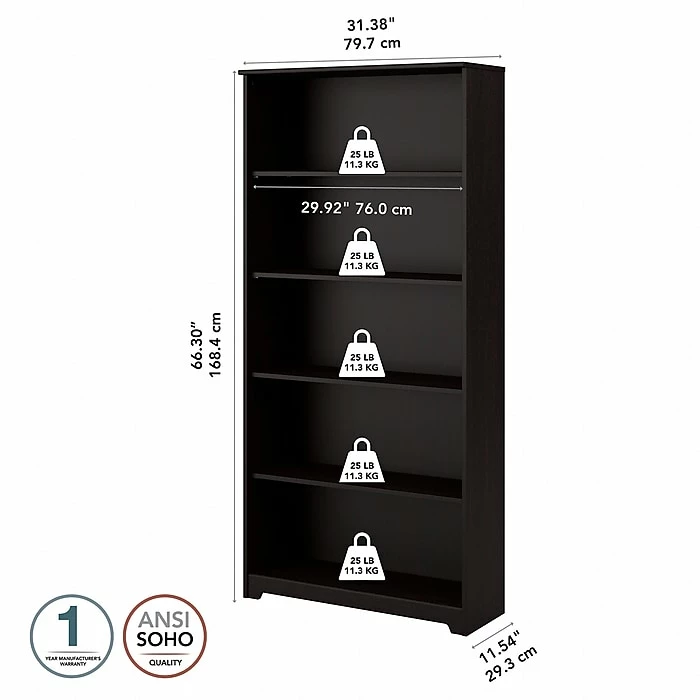 This attractive Bush Furniture Cabot 5 Shelf Bookcase is perfect for the home office or anywhere storage is needed. Its slender profile and 5 shelf design mix style with function at a great value. Use on its own or group a few together for a complete storage wall design. When outfitting an office use this Bookcase next to the Cabot Desk with Hutch combination (sold separately) for a seamless look as they match in height. The sophisticated, stable design has two fixed shelves for structural strength while three adjustable shelves let you customize so all of your items are sure to fit. The bookshelf lets you easily stow books, binders, decorative bins, accents and more. Meets ANSI/SOHO test standards for safety and performance. A stylish and timeless design with rich finish complements any environment. See the full collection for coordinating items. Backed by a 1 Year Warranty.