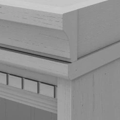 - Distressed finish options include solid Cape Cod gray, antique white with tea maple, pure white with shiplap gray, or antique black with Hansen cherry