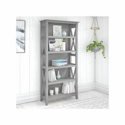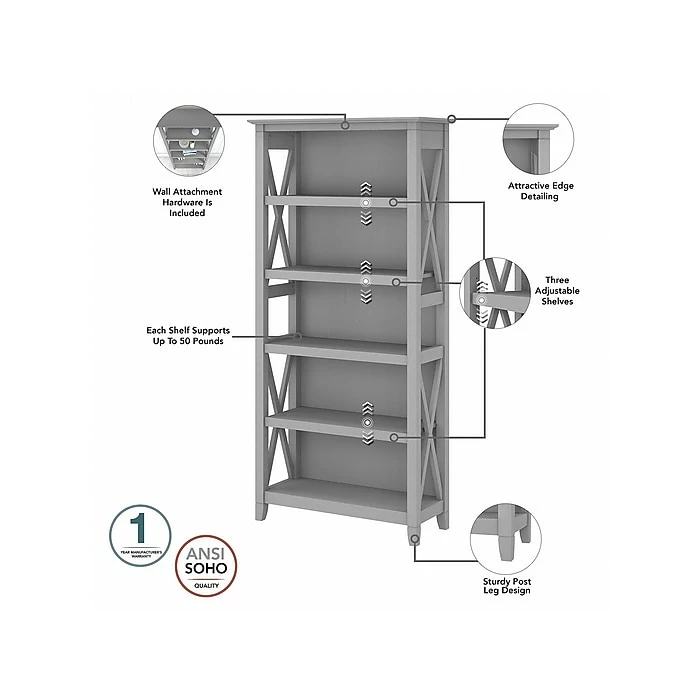 The Bush Furniture Key West tall five-shelf bookcase is a perfect way to show off your favorite artwork, photos, plants, and more. Three adjustable shelves accommodate items of various sizes while two fixed shelves provide stability. Each shelf supports up to 50 lbs. so you can store your personal library and display decorations with confidence. Stylish touches include unique X-pattern accents on the side panels as well as a sturdy and attractive post leg design. This five-tier bookcase includes wall attachment hardware for family-friendly safety and security in any home office or living room. A perfect choice for homes that embrace cottage, coastal, and farmhouse decor, the Bush Furniture Key West collection includes a variety of coordinating items to expand your space as needed. This tall bookcase is tested to meet ANSI/SOHO quality standards for safety and performance and is backed by a 1-year manufacturer warranty.