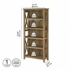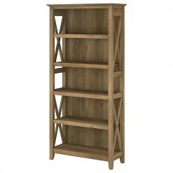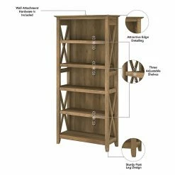 The Bush Furniture Key West tall five-shelf bookcase is a perfect way to show off your favorite artwork, photos, plants, and more. Three adjustable shelves accommodate items of various sizes while two fixed shelves provide stability. Each shelf supports up to 50 lbs. so you can store your personal library and display decorations with confidence. Stylish touches include unique X-pattern accents on the side panels as well as a sturdy and attractive post leg design. This five-tier bookcase includes wall attachment hardware for family-friendly safety and security in any home office or living room. A perfect choice for homes that embrace cottage, coastal, and farmhouse decor, the Bush Furniture Key West collection includes a variety of coordinating items to expand your space as needed. This tall bookcase is tested to meet ANSI/SOHO quality standards for safety and performance and is backed by a 1-year manufacturer warranty.