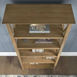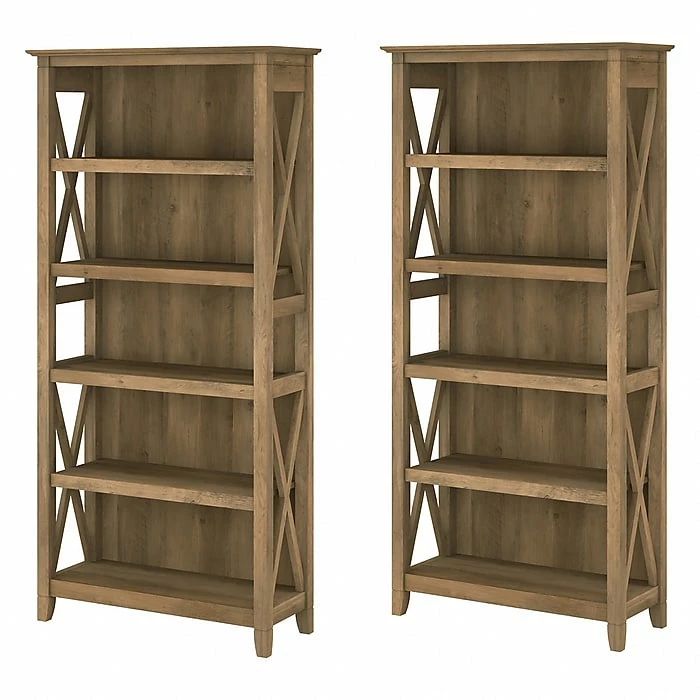 The Bush Furniture Key West tall five-shelf bookcase set is a perfect way to show off your favorite artwork, photos, plants, and more. These matching bookcases each include three adjustable shelves to accommodate items of various sizes and two fixed shelves for stability. Each shelf supports up to 50 lbs. so you can store your collection of paperback and hardcover books or display decorations with confidence. Place the tall bookshelf set side by side to create a storage wall or position them separately based on the needs of your space. Stylish touches include X-pattern accents on the side panels as well as a sturdy and attractive post-leg design. Wall attachment hardware is included for family-friendly safety and security in any home office or living room. These five-shelf bookcases are tested to meet ANSI/SOHO quality standards for safety and performance and are backed by a 1-year manufacturer warranty.