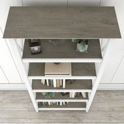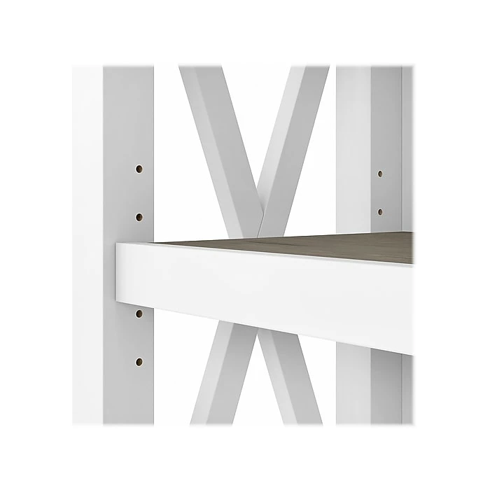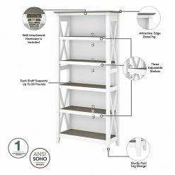 The Bush Furniture Key West tall five-shelf bookcase set is a perfect way to show off your favorite artwork, photos, plants, and more. These matching bookcases each include three adjustable shelves to accommodate items of various sizes and two fixed shelves for stability. Each shelf supports up to 50 lbs. so you can store your collection of paperback and hardcover books or display decorations with confidence. Place the tall bookcases side by side to create a storage wall or position them separately based on the needs of your space. Stylish touches include X-pattern accents on the side panels as well as a sturdy and attractive post leg design. Wall attachment hardware is included for family-friendly safety and security in any home office or living room. These five-shelf bookcases are tested to meet ANSI/SOHO quality standards for safety and performance and are backed by a 1-year manufacturer warranty.