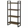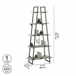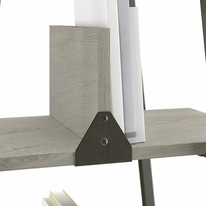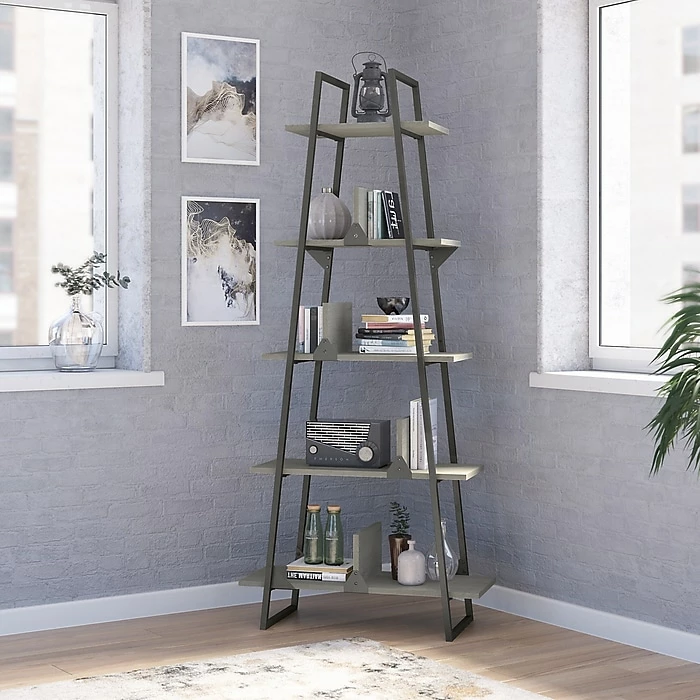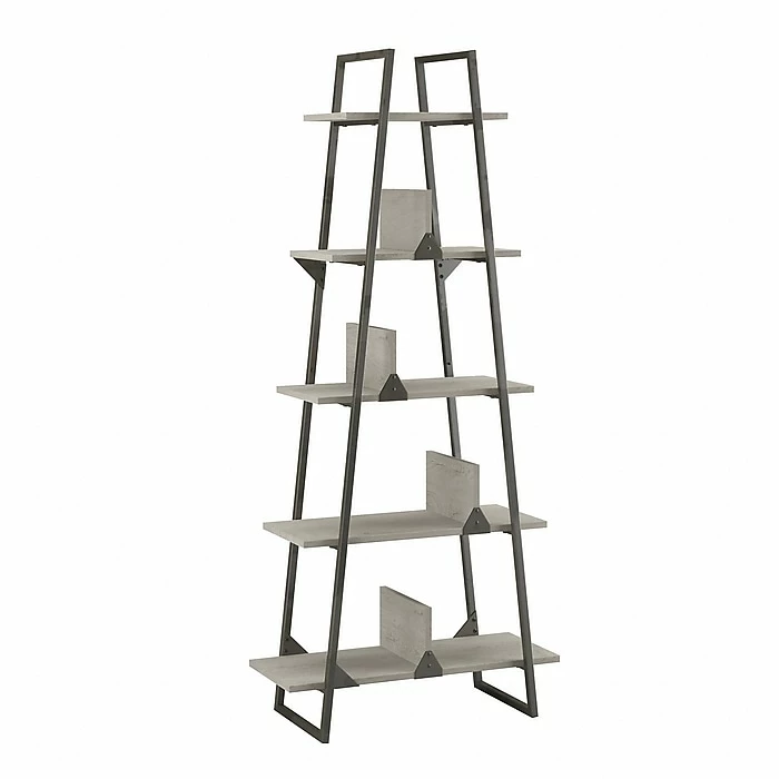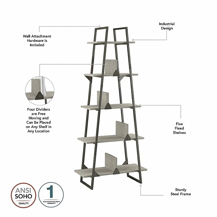 The Bush Furniture Refinery A-frame etagere bookcase brings strength, style, and functionality into any home office, loft, or living room. Organize your personal library, or show off your favorite pictures and decorations with five fixed shelves, four free-moving dividers, and one beautifully aged design. Unique and sturdy, the tall bookcase design features open industrial steel sides along with exposed bolts and a distressed finish to complement your rustic industrial home decor. Move the dividers anywhere on the five-shelf bookcase to decorate or organize your home office. Wall attachment hardware is included to provide family-friendly safety and security anywhere in the home. This etagere bookcase has been tested to meet ANSI/SOHO standards for safety and performance and is backed by a 1-year warranty. View the full line of industrial furniture to find the perfect fit for your space.