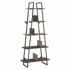 Five fixed shelves, four free-moving dividers and one beautifully aged design to complement your rustic industrial home décor. The Bush Furniture Refinery A Frame Bookshelf brings strength, style and functionality into the home office, loft or living room. A weathered Rustic Gray finish and Charred Wood accent shelves create a reclaimed, distressed look in a durable laminate construction. Unique and sturdy, the A Frame Bookshelf design contains open Industrial Steel sides along with exposed bolts. Move the dividers anywhere on the 5 shelf bookcase to decorate or organize your home office. Display your industrial tastes with the A Frame Bookshelf, backed by a Bush Furniture 1 Year Warranty. Meets ANSI/SOHO furniture standards for safety and durability.