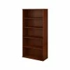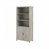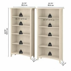 Decorative yet functional, this Bush Furniture Salinas set of two five-shelf bookcases brings comfortable storage and display to any room in your home. Inspired by timeless mission style, the set conveys a relaxing farmhouse charm with its attractive wood accents and tapered legs. Decorative detailing and curved base rails create a casual construction equally fit for a living room or home office. Each tall bookcase is built with three adjustable shelves for flexible storage and two fixed shelves for stability to proudly display your personal library along with photos and decorations. Each shelf supports up to 50 lbs., so storing larger items is never a problem. This matching bookcase set is tested to meet ANSI/SOHO standards for safety and performance and is backed by a 1-year manufacturer warranty. See the full collection for coordinating items available.