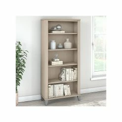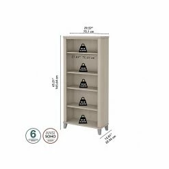 Turn any space into your own personal library with the Bush Furniture Somerset tall five-shelf bookcase. With a tapered leg design and your choice of several attractive finishes, this bookcase is a perfect way to organize any home office or living space. Two shelves are fixed to provide structural strength, and three are adjustable so your items are sure to fit. The height of the bookcase matches that of a Bush Furniture Somerset desk and hutch combination (sold separately) to create a coordinated appearance. Its sturdy construction and durable laminate finish allow you to display books, decorations, and more for years to come. This tall bookcase is tested to meet ANSI/SOHO standards for safety and performance and is backed by a 6-year manufacturer warranty. See the full collection for coordinating items to expand your home office.