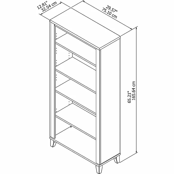 Turn any space into your own personal library with the Bush Furniture Somerset 5 Shelf Bookcase. With a tapered leg design and your choice of three beautiful finishes, this bookshelf is a perfect choice to complete your home office. Two shelves are fixed to provide structural strength, and three are adjustable so your items are sure to fit. The height of the Bookcase matches that of a Somerset Desk with Hutch combination to create a coordinated appearance. Its sturdy construction and durable laminate finish allow you to display books, trinkets and more for years to come. This quality furniture is tested to meet ANSI/SOHO standards for safety and performance and is backed by the Bush Furniture 6 Year Manufacturer’s Warranty. See the full Somerset Collection for coordinating items to expand your home office. American made with U.S. and imported parts.