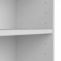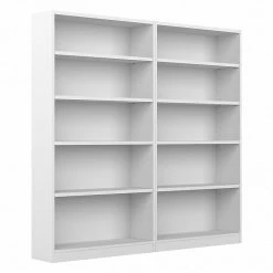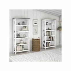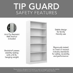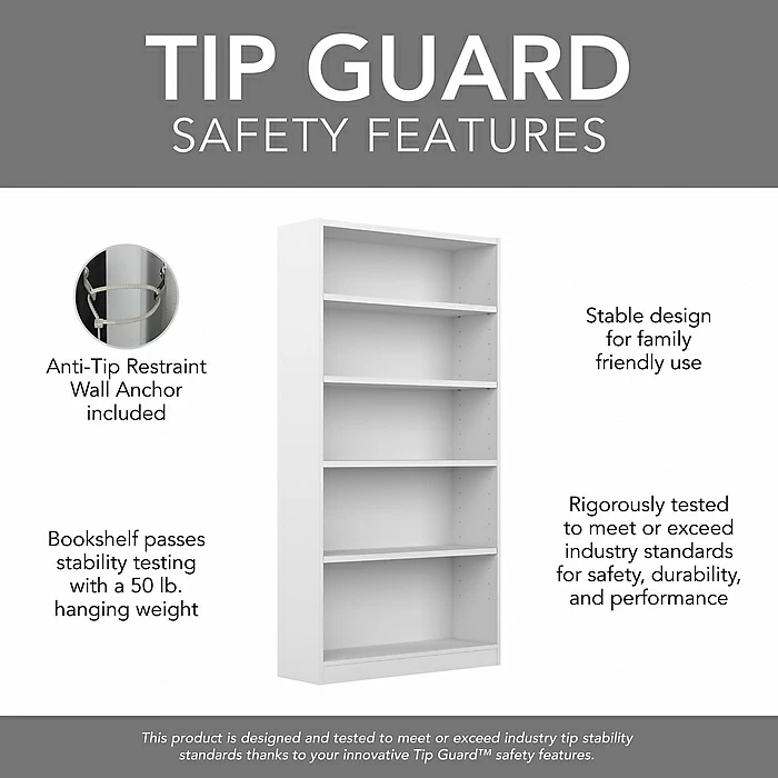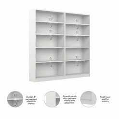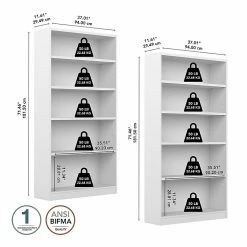 The Bush Furniture Universal Tall 5 Shelf Bookcase – Set of 2 provides a versatile organization solution that allows you to show off your personal library or brighten up the room with pictures and decorations. Each Bookcase has three adjustable shelves that move up and down to accommodate larger items like binders and photo albums while two fixed shelves offer added stability. The sturdy one-inch thick shelves prevent sagging and have a weight capacity of 50 pounds each, so storing magazines, hardcover books, or vinyl records is never a problem. Tip Guard(TM) safety features include a stable design and wall attachment hardware for family-friendly safety in any space. The bookcases have been tested with a 50 pound hanging weight to create a safe environment in any space. This tall bookshelf set meets ANSI/BIFMA standards for safety and performance and is backed by a 1 Year Warranty.