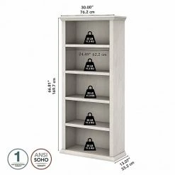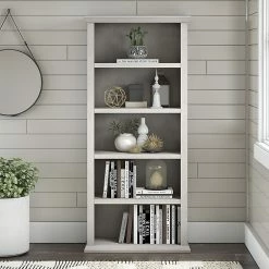 The Bush Furniture Yorktown tall five-shelf bookcase presents a stylish and practical solution for organizing any work or living space. Use the five-tier bookshelf to showcase your personal library or brighten up the room with pictures and home decor. Three adjustable shelves move up and down to accommodate items of various sizes while two shelves are fixed for stability. Each shelf supports up to 25 lbs., so you can store a collection of hardcover books and display larger decorations with confidence. Wall attachment hardware is included for family-friendly safety and security. Bush Furniture Yorktown’s classic charm is highlighted by stylish beveled edge detailing and comes in your choice of several attractive finishes. This vertical bookshelf is tested to meet ANSI/SOHO standards for safety and performance and is backed by a 1-year manufacturer warranty. See the full collection for coordinating items available.