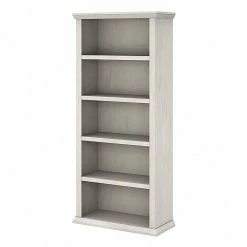 The Bush Furniture Yorktown tall five-shelf bookcase presents a stylish and practical solution for organizing any work or living space. Use the five-tier bookshelf to showcase your personal library or brighten up the room with pictures and home decor. Three adjustable shelves move up and down to accommodate items of various sizes while two shelves are fixed for stability. Each shelf supports up to 25 lbs., so you can store a collection of hardcover books and display larger decorations with confidence. Wall attachment hardware is included for family-friendly safety and security. Bush Furniture Yorktown’s classic charm is highlighted by stylish beveled edge detailing and comes in your choice of several attractive finishes. This vertical bookshelf is tested to meet ANSI/SOHO standards for safety and performance and is backed by a 1-year manufacturer warranty. See the full collection for coordinating items available.