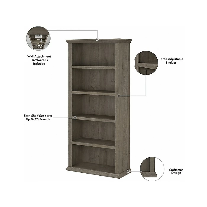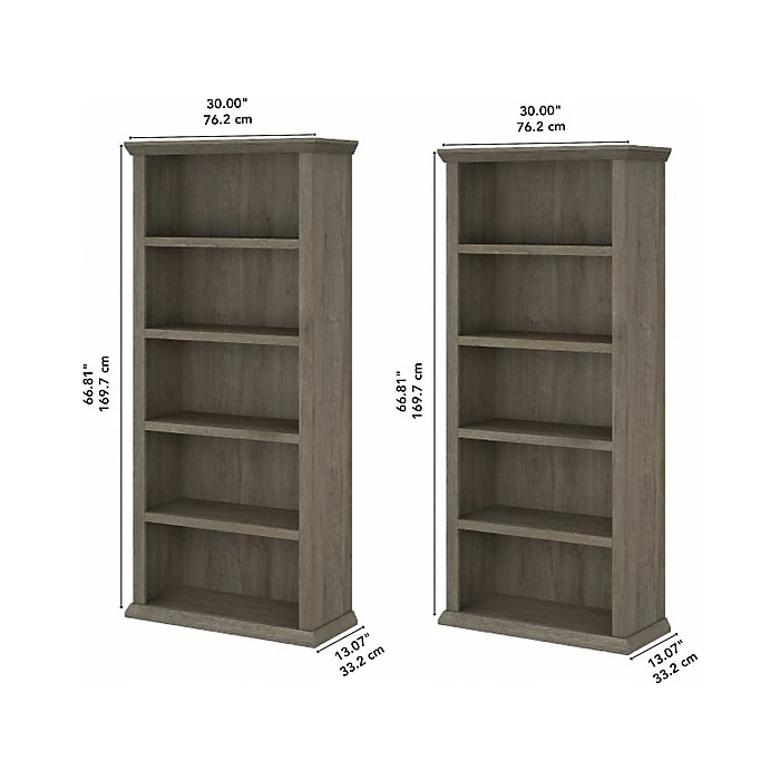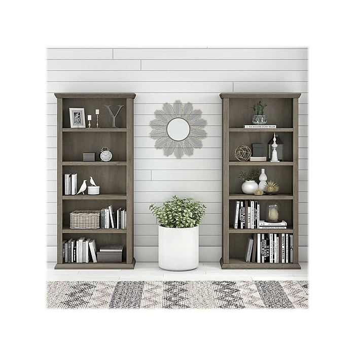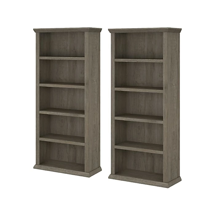 The Bush Furniture Yorktown tall five-shelf bookcase set of two presents a stylish and practical solution for organizing any work or living space. Use the matching bookcase set to showcase your personal library or brighten up the room with pictures and home decor. Each bookcase includes three adjustable shelves that move up and down to accommodate items of various sizes and two shelves that are fixed for stability. Each shelf supports up to 25 lbs., so you can store a collection of hardcover books and display larger decorations with confidence. Wall attachment hardware is included for family-friendly safety and security. Bush Furniture Yorktown’s classic charm is highlighted by stylish beveled edge detailing and comes in your choice of several attractive finishes. This tall bookshelf set is tested to meet ANSI/SOHO standards for safety and performance and is backed by a 1-year manufacturer warranty.