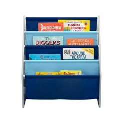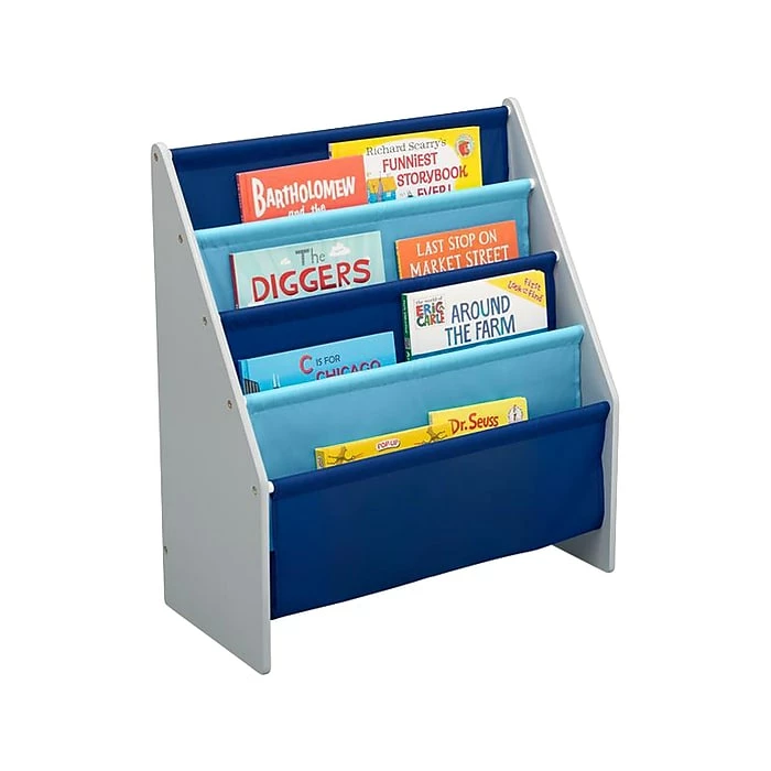 - Four blue soft fabric storage pockets offer the perfect storage space for books of all shapes and sizes, magazines, folders, binders, or coloring books