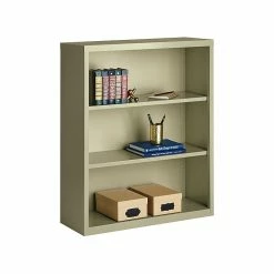- Three-shelf steel bookcase in baked putty enamel finish perfect for schools, libraries, and offices