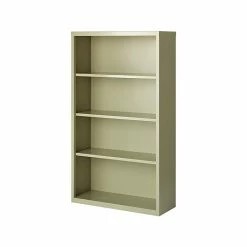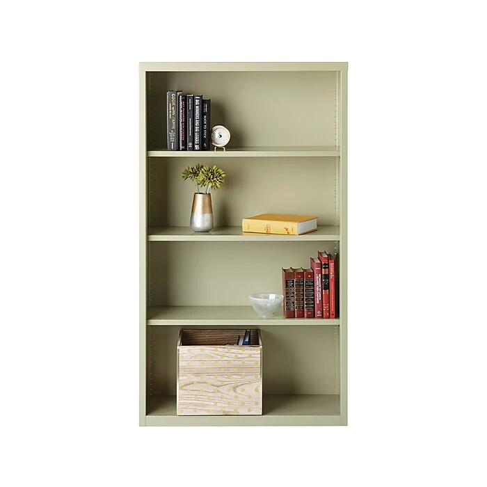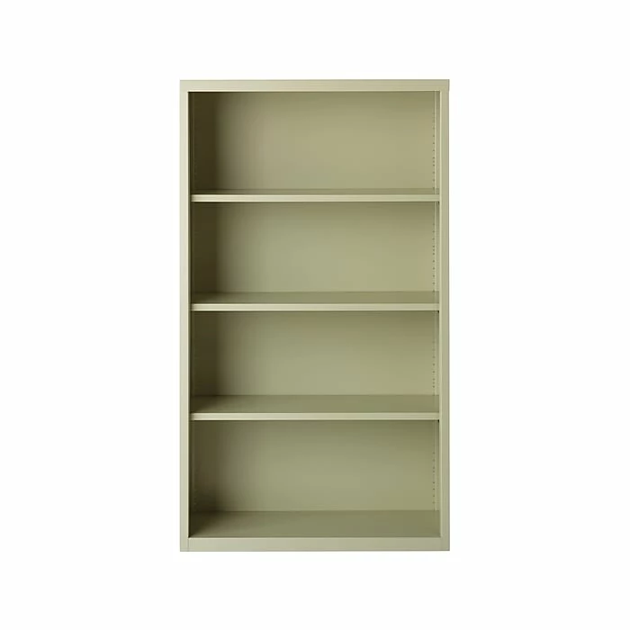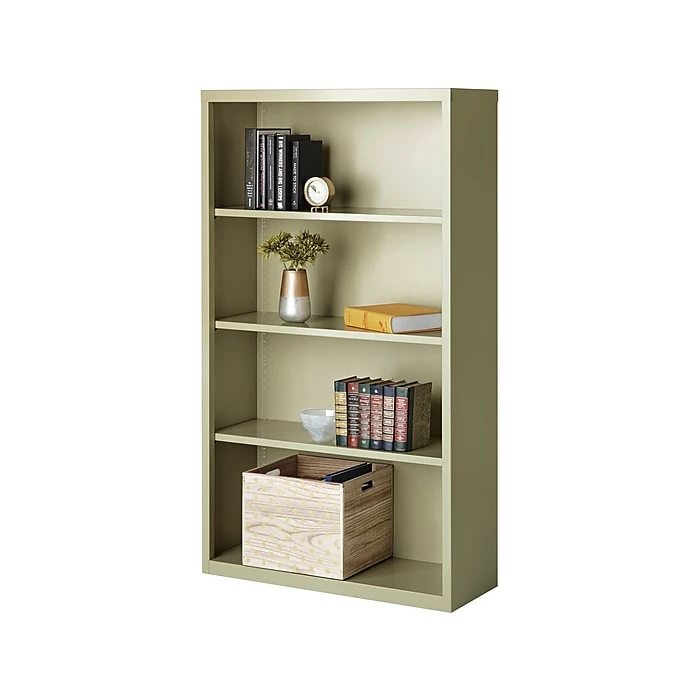 - Standard four-shelf bookcase is made of steel in putty finish