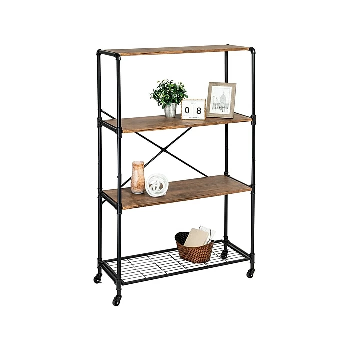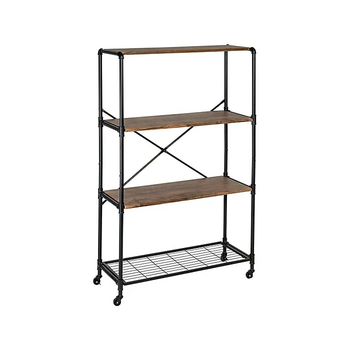 - Mobile bookcase is made of powder-coated black steel with MDF shelves and bottom steel shelf