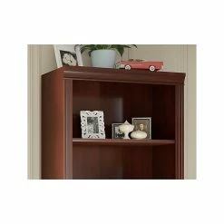 Classic furniture built to last, choose the kathy ireland® Home by Bush Furniture Bennington 5 Shelf Bookcase. This timeless slender design fits where you need it most or add multiples side by side for a complete storage wall design. Bookcase includes three adjustable shelves and two fixed shelves and features decorative edge detailing which adds to it’s refined elegance and charm. The rich Harvest Cherry finish complements virtually any room or decor. Durably constructed, this product meets ANSI BIFMA furniture standards for safety and performance. Bring a sense of timeless style and tradition into your home or workspace with this and other products from the Bennington Collection. See the full line for other items available all backed by a 6 year manufacturers warranty.