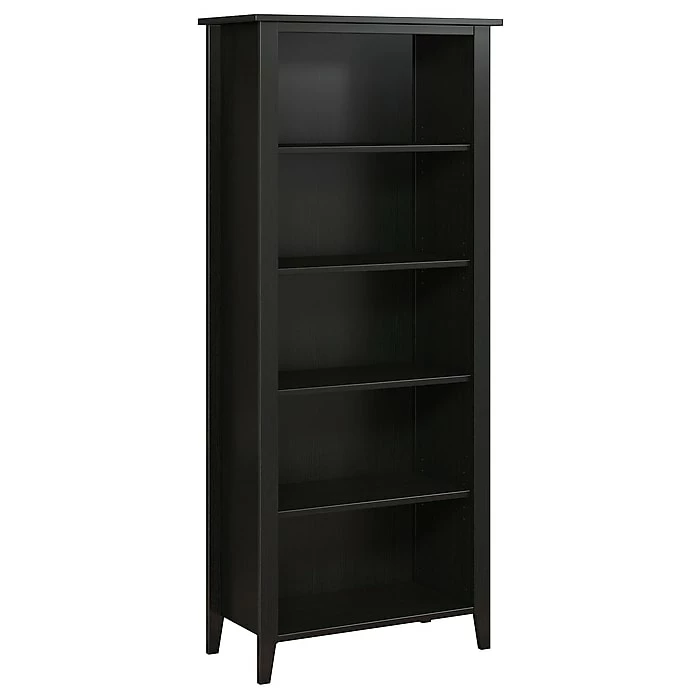 The kathy ireland® Home by Bush Furniture Connecticut 5 Shelf Bookcase, a storage essential for any home office. The Black Suede Oak durable laminate finish has a traditional elegance that adapts to a variety environments. Includes three adjustable shelves for storage flexibility and two fixed shelves for added stability. A great place for display items or books and binder storage. The architectural styling features a tapered leg design with clean, sleek contemporary lines. This Bookcase is a perfect addition for a library, home office or additional storage throughout your home. Construction meets ANSI/SOHO furniture standards for strength and durability for affordable home furnishings backed by a 3-year Manufacturers Warranty. For a total office solution, see the full Collection for coordinating items available.