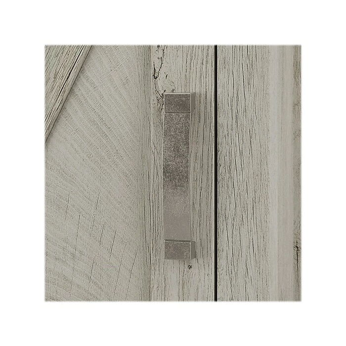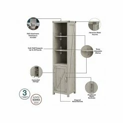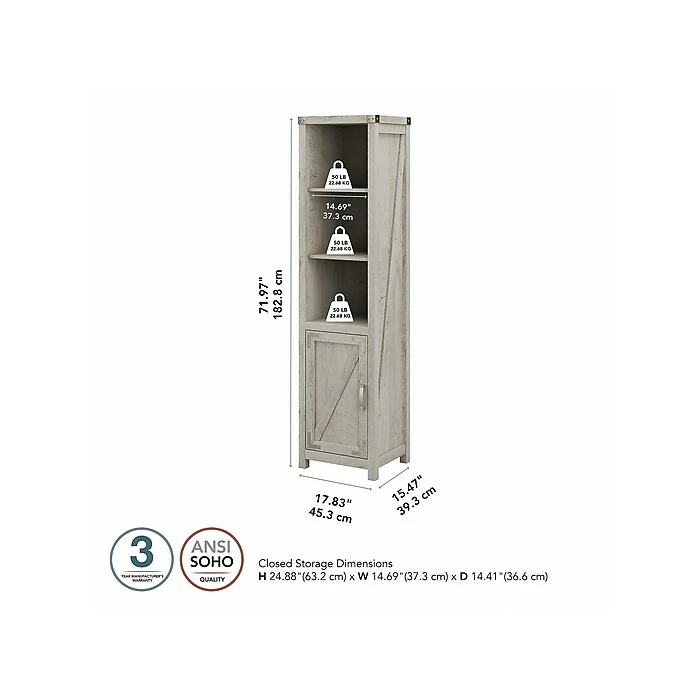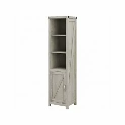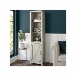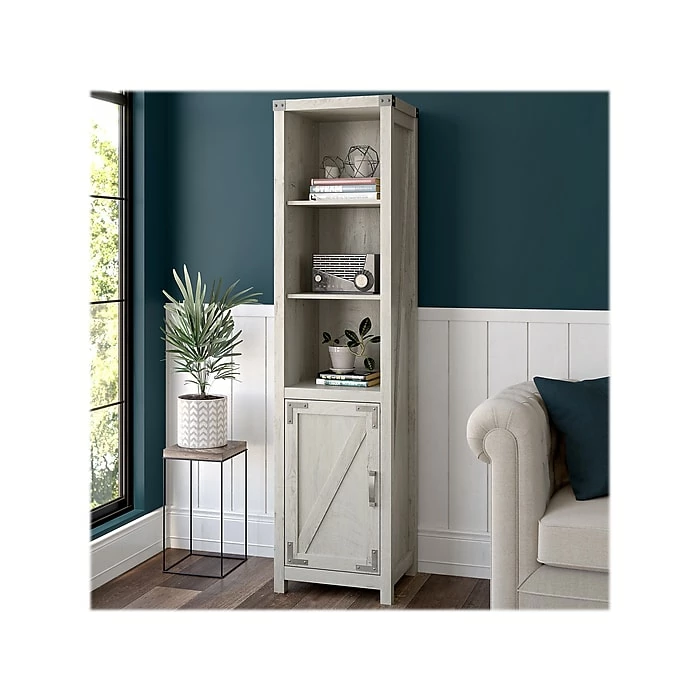 The kathy ireland Home by Bush Furniture Cottage Grove tall narrow five-shelf bookcase with door offers a practical storage and display solution with appealing modern farmhouse style. Use the top of the bookshelf to brighten up any room with pictures and decorations or organize a collection of paperback and hardcover books. Two of the upper shelves can be raised or lowered to accommodate items of various sizes, and the bottom storage cabinet also contains an adjustable shelf so larger materials can be kept in order but out of sight. Each shelf supports up to 50 lbs. Hardware is included to anchor the bookcase to a wall for maximum stability in your home office, living room, entryway, or any other residential space.