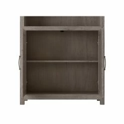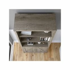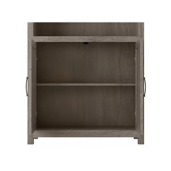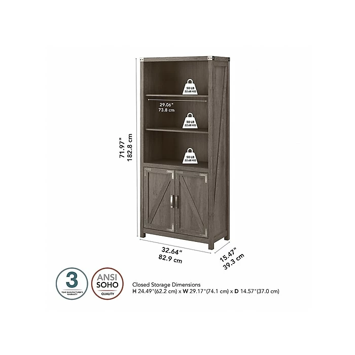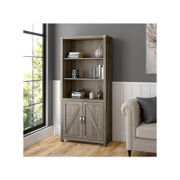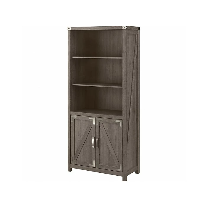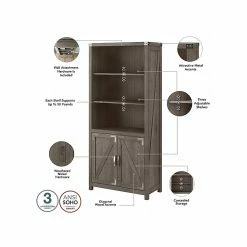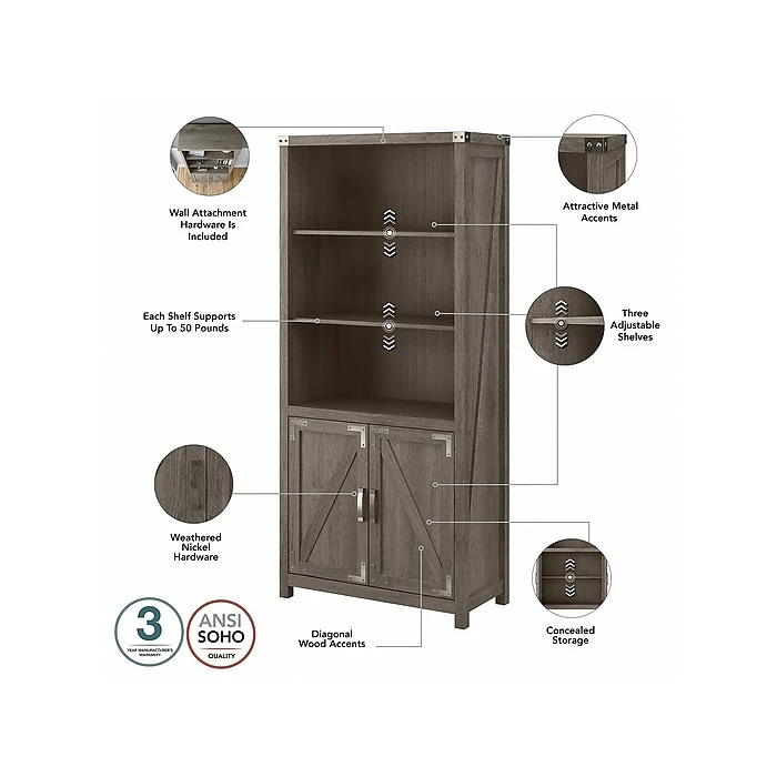 The kathy ireland Home by Bush Furniture Cottage Grove tall five-shelf bookcase with doors offers a practical storage and display solution with appealing modern farmhouse style. Use the top of the bookshelf to brighten up any room with pictures and decorations or organize a collection of paperback and hardcover books. Two of the upper shelves can be raised or lowered to accommodate items of various sizes, and the bottom storage cabinet also contains an adjustable shelf so larger materials can be kept in order but out of sight. Each shelf supports up to 50 lbs. Hardware is included to anchor the bookcase to a wall for maximum stability in your home office, living room, entryway, or any other residential space.