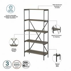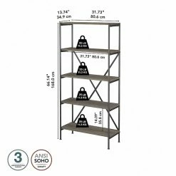 The kathy ireland Home by Bush Furniture Ironworks five-shelf etagere bookcase presents a stylish and durable organization solution for the home or office. All shelves are fixed for stability and feature a weight capacity of 25 lbs. each, while the welded steel base and framework provide structural strength and add to the Ironworks industrial era style. Open shelving allows for convenient storage of books, binders, and manuals and offers a unique display space for your favorite trinkets and mementos. Its 32″W x 66″H vertical design maximizes storage and display capacity without taking up too much floor space, making this bookshelf a good fit for any room. This tall bookcase is tested to meet the ANSI/SOHO quality standards for safety and performance and is backed by the Bush Furniture 3-year manufacturer limited warranty. See the full collection for more vintage industrial home furnishings.