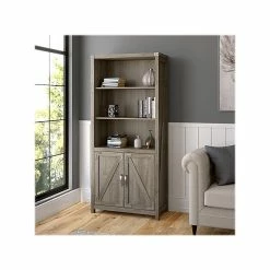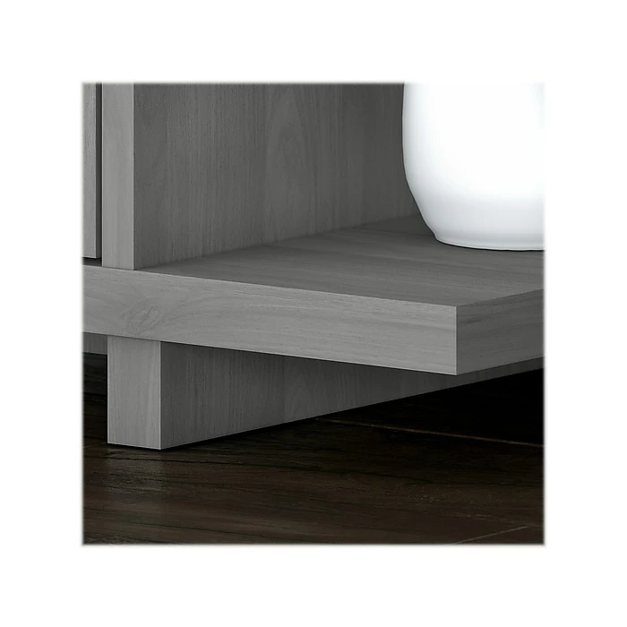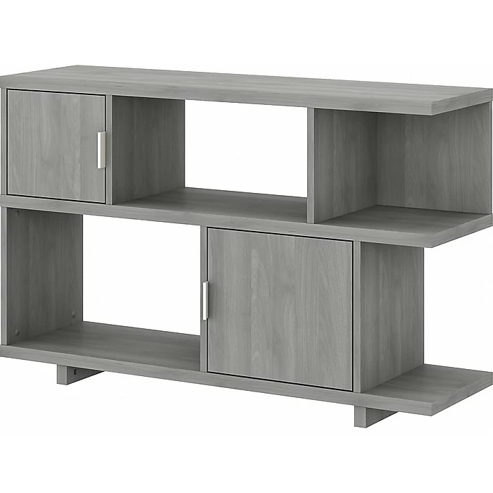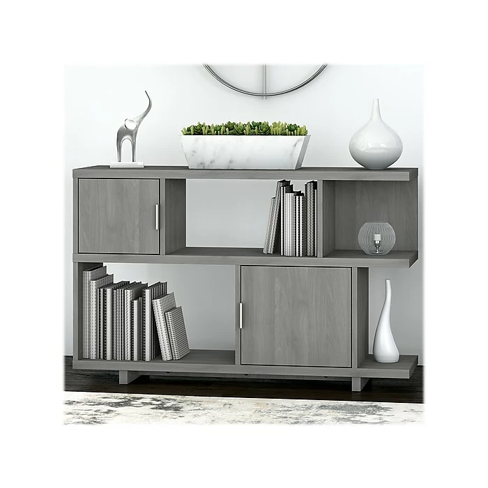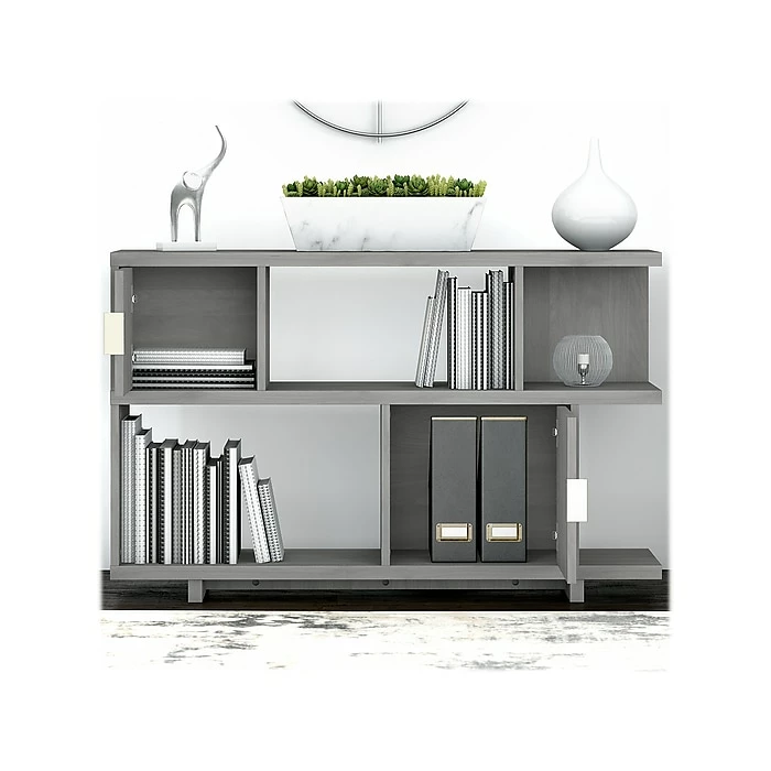 The stylish and progressive kathy ireland® Home by Bush Furniture Madison Avenue low geometric bookcase with doors offers a perfect solution for maintaining an organized work or living space. Take advantage of the modern asymmetrical design to store work materials in your home office, or brighten up any common area with pictures and decorations. Two open shelves showcase books and home decor while two small storage cabinets conceal the materials you want hidden from view. Each tier supports up to 50 lbs., so you can use the low bookcase to confidently store and display larger items. Cabinet doors feature smooth Euro-style hinges for a soft open and close. Find the perfect style to complement your space with three attractive finish options. This small bookcase with doors is tested to meet ANSI/SOHO quality standards for safety and performance and is backed by a 3-year warranty.
