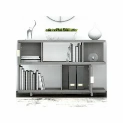 - Low geometric bookcase with doors offers a practical storage solution for modern homes and offices; comes laminated over engineered wood in modern gray