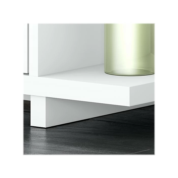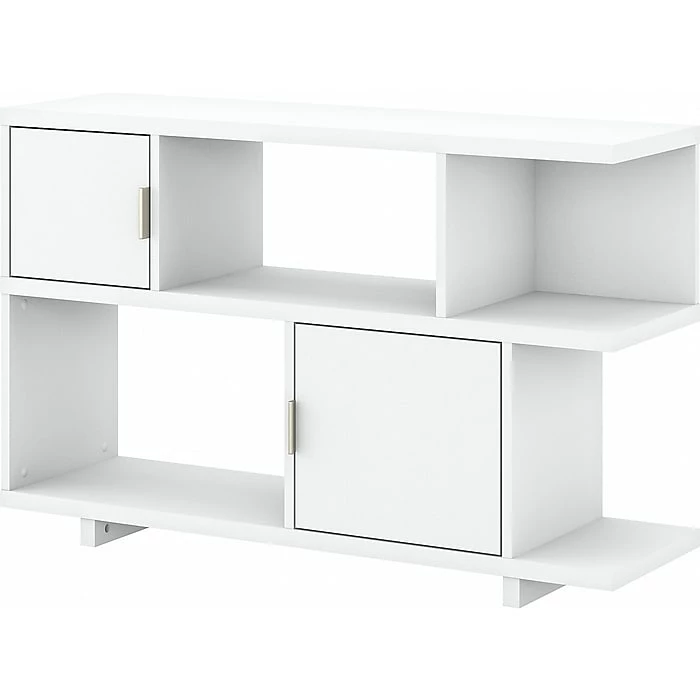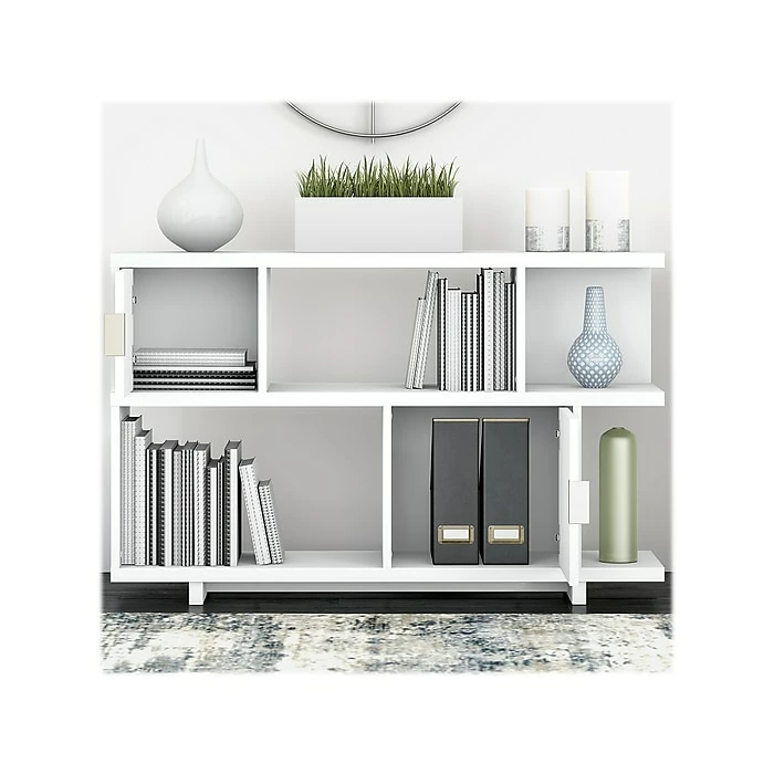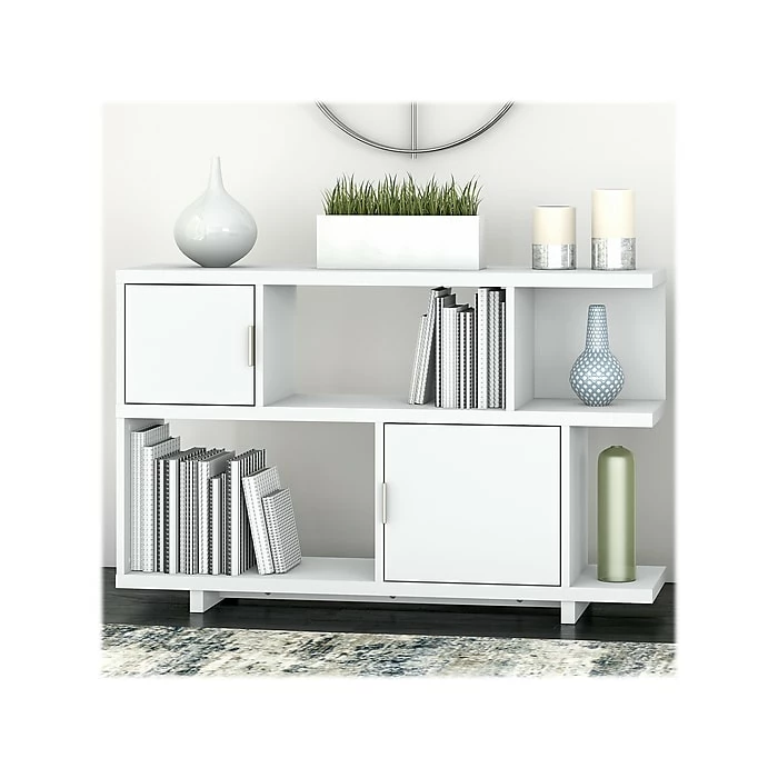 The stylish and progressive kathy ireland® Home by Bush Furniture Madison Avenue low geometric bookcase with doors offers a perfect solution for maintaining an organized work or living space. Take advantage of the modern asymmetrical design to store work materials in your home office, or brighten up any common area with pictures and decorations. Two open shelves showcase books and home decor while two small storage cabinets conceal the materials you want hidden from view. Each tier supports up to 50 lbs., so you can use the low bookcase to confidently store and display larger items. Cabinet doors feature smooth Euro-style hinges for a soft open and close. Find the perfect style to complement your space with three attractive finish options. This small bookcase with doors is tested to meet ANSI/SOHO quality standards for safety and performance and is backed by a 3-year warranty.