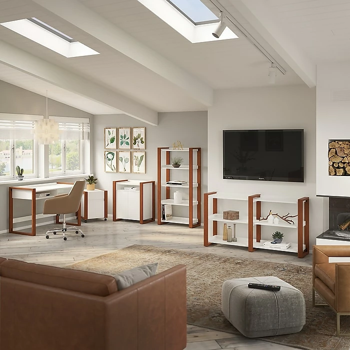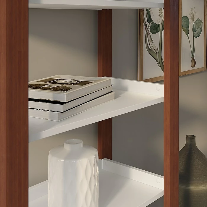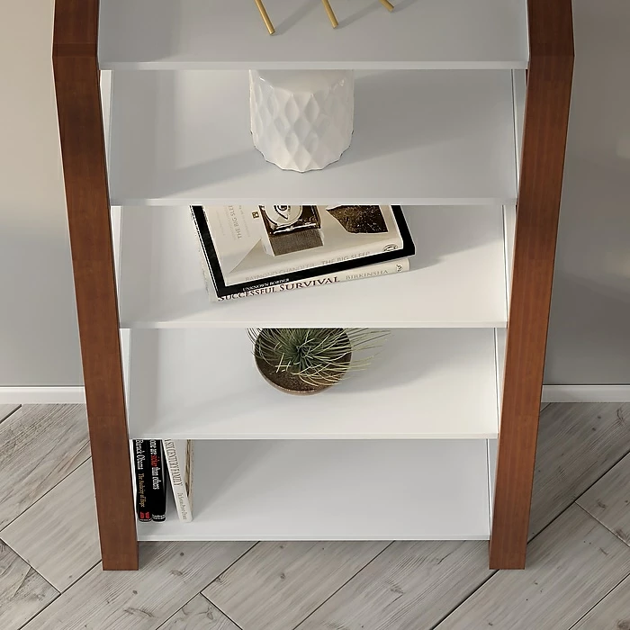 - Cotton White finish with Serene Cherry legs give the bookshelf a crisp, contemporary look
