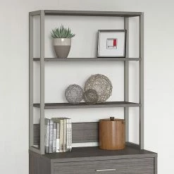 Embrace the unique styling of mid century modern design and enjoy ample storage with the Office by kathy ireland® Method Bookcase Hutch. The modern hutch offers a beautiful and durable titanium finished metal frame. Constructed of 100% thermally fused laminate, the shelves fend off scratches and stains to maintain the attractive design. Organize and display your favorite books, photos and knickknacks on the open shelves. A perfect addition to a professional space, home office or loft, the hutch mounts to the Method Bookcase or Lateral File Cabinet (both sold separately) to provide a complete storage solution. From Office by kathy ireland® and Bush Business Furniture, the Method collection comes with a 6 Year Manufacturer’s Warranty and meets ANSI/BIFMA standards. See the full line of commercial office furniture for coordinating items. American made with U.S. and imported parts.