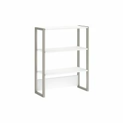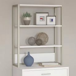 Embrace the unique styling of mid century modern design and enjoy ample storage with the Office by kathy ireland® Method Bookcase Hutch. The modern hutch offers a beautiful and durable titanium finished metal frame. Constructed of 100% thermally fused laminate, the shelves fend off scratches and stains to maintain the attractive design. Organize and display your favorite books, photos and knickknacks on the open shelves. A perfect addition to a professional space, home office or loft, the hutch mounts to the Method Bookcase or Lateral File Cabinet (both sold separately) to provide a complete storage solution. From Office by kathy ireland® and Bush Business Furniture, the Method collection comes with a 6 Year Manufacturer’s Warranty and meets ANSI/BIFMA standards. See the full line of commercial office furniture for coordinating items. American made with U.S. and imported parts.