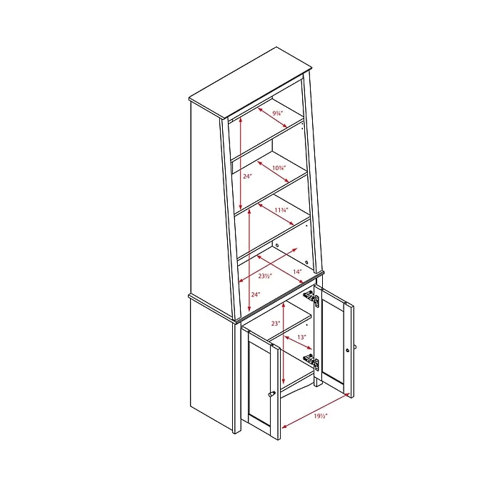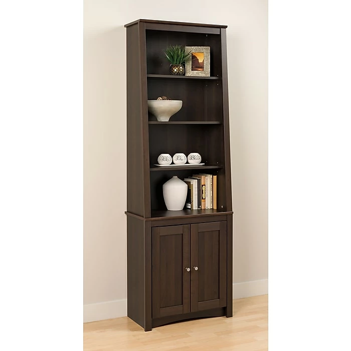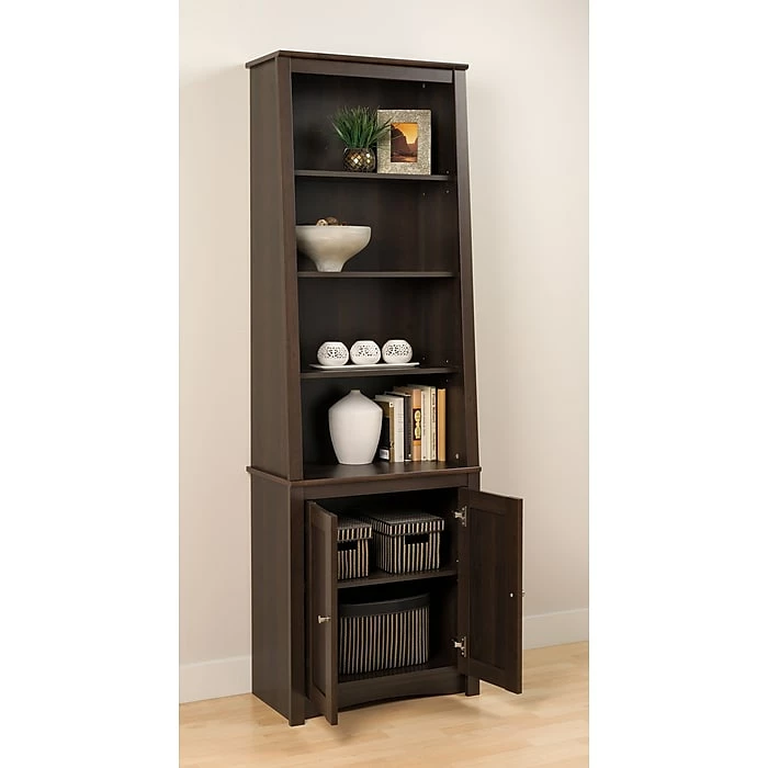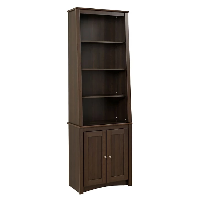 Prepac™ Slant back bookcase with two shaker doors in espresso finish is an ideal addition to your office or living room. Bookcase is constructed from CARB-compliant laminated composite woods which give an elegant look to any room.