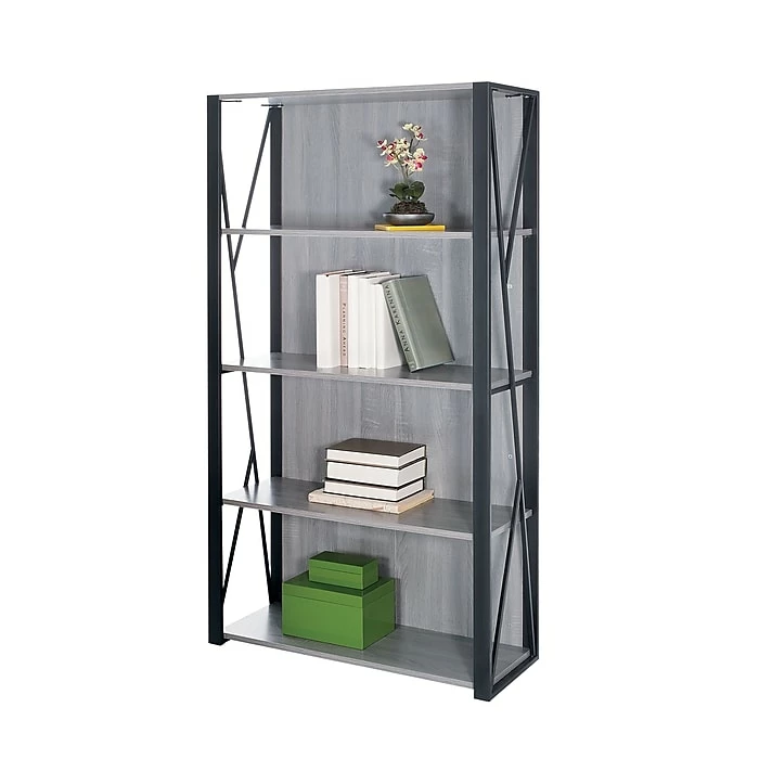 - Constructed of sturdy black powder coated steel with a laminate gray woodgrain finish